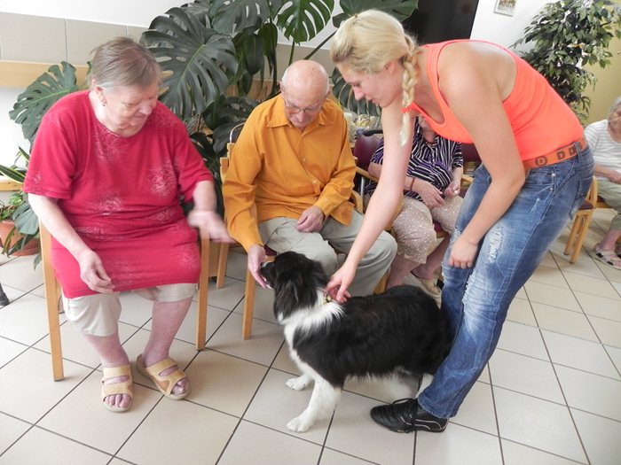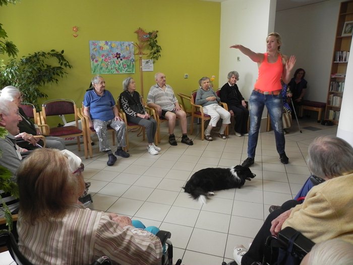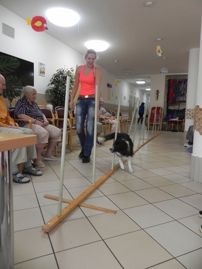 Vzhledem k deštivému počasí se akce uskutečnila na odděleních našeho domova. Agility je sport se psy, ve kterém jde o nejrychlejší překonání dráhy v určitý čas. Překonávání překážek je pro psy jedna z nejpřirozenějších aktivit, kromě toho každým pravidelným tréninkem získává pes výbornou příležitost se stýkat s ostatními psy i lidmi a to nám Brittka bravurně předvedla. Neměla problém s chodítky ani s vozíčky klientů, vše vnímala velmi přirozeně. Ukázala nám slalom, panáčkování, chůzi po zadních končetinách a další um a „třešničkou na dortu“ byly přeskoky přes trenérčiny nohy. Vystoupení bylo skvělé a pohladilo na duši naše klienty a těšíme se na další „psí“návštěvu.