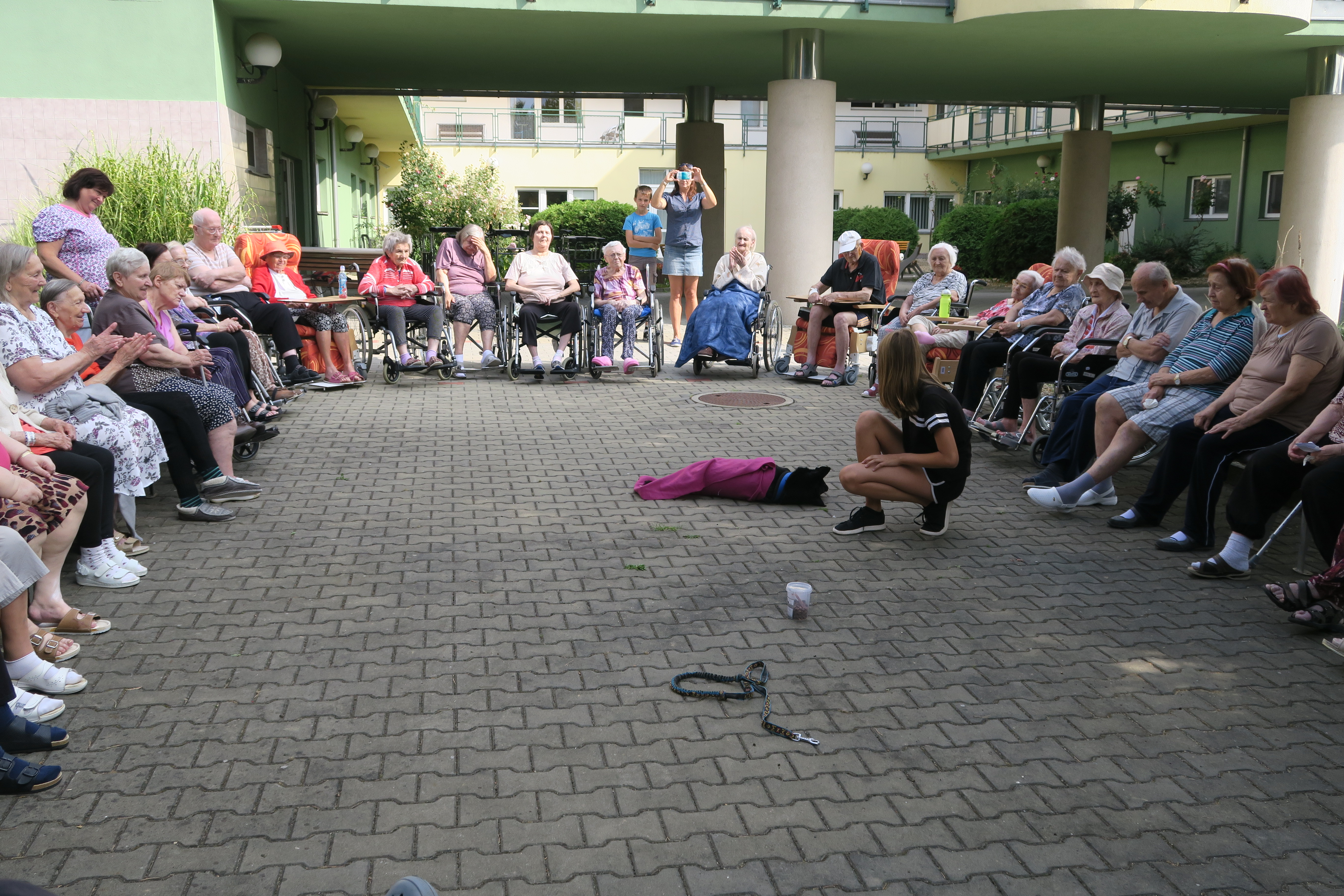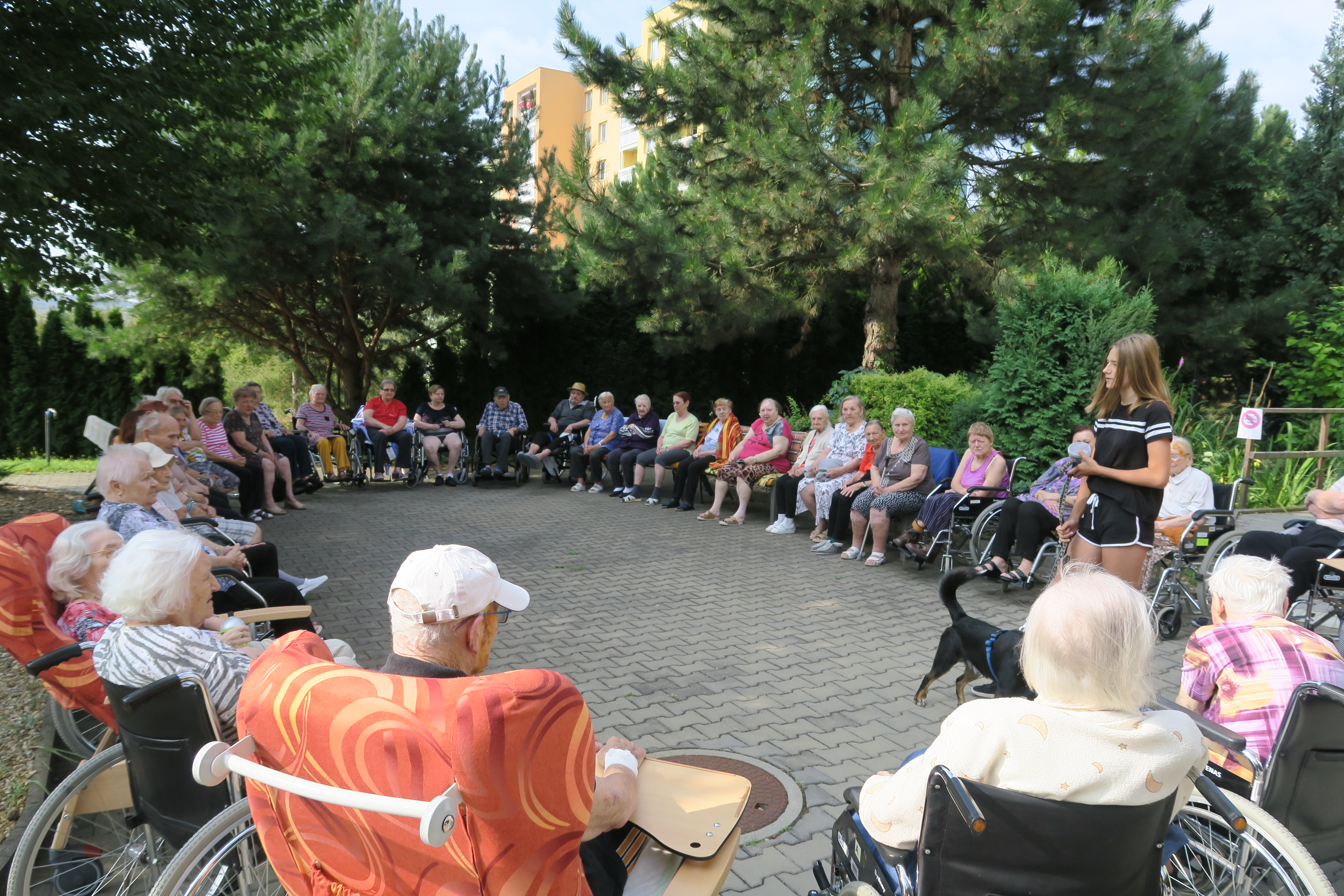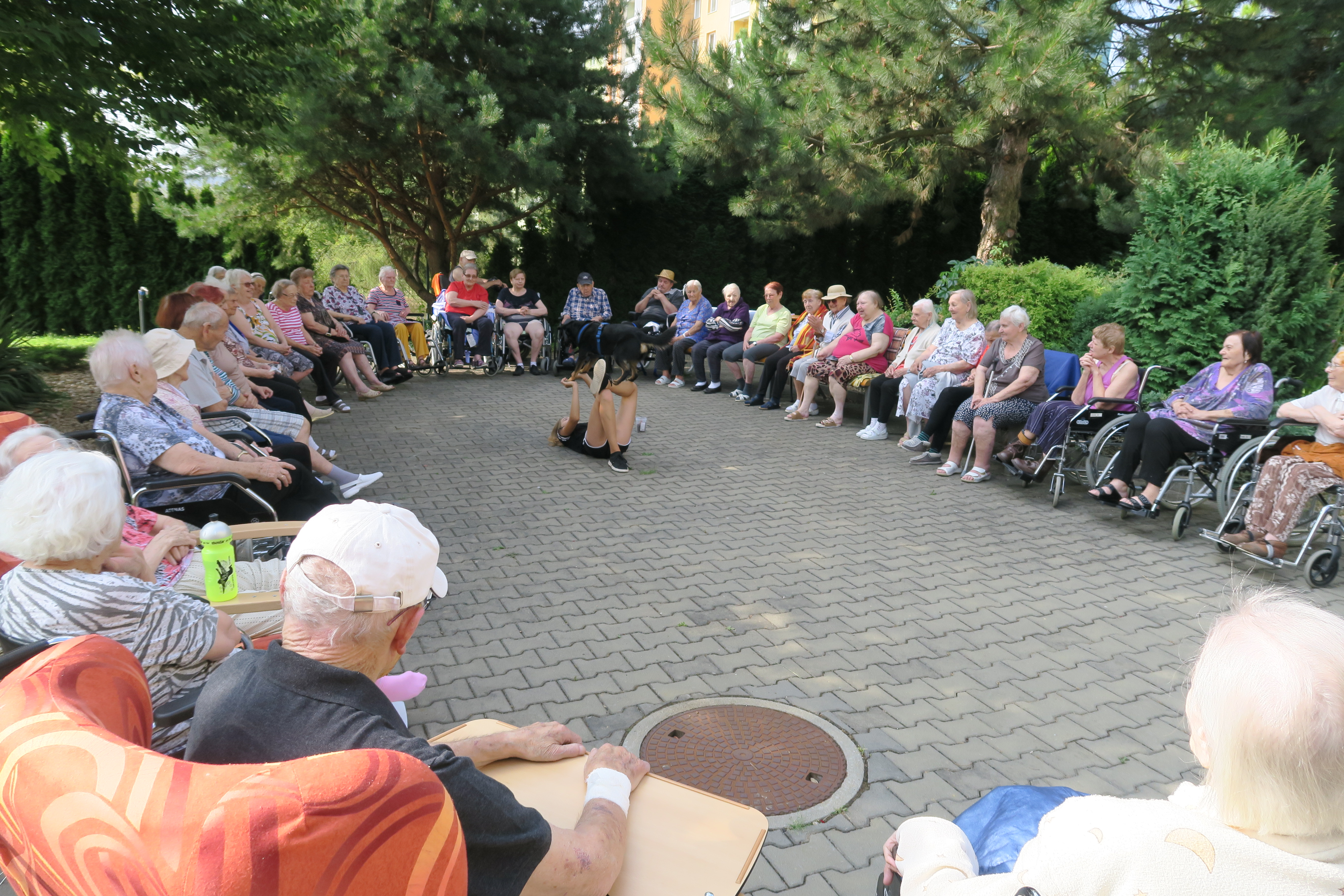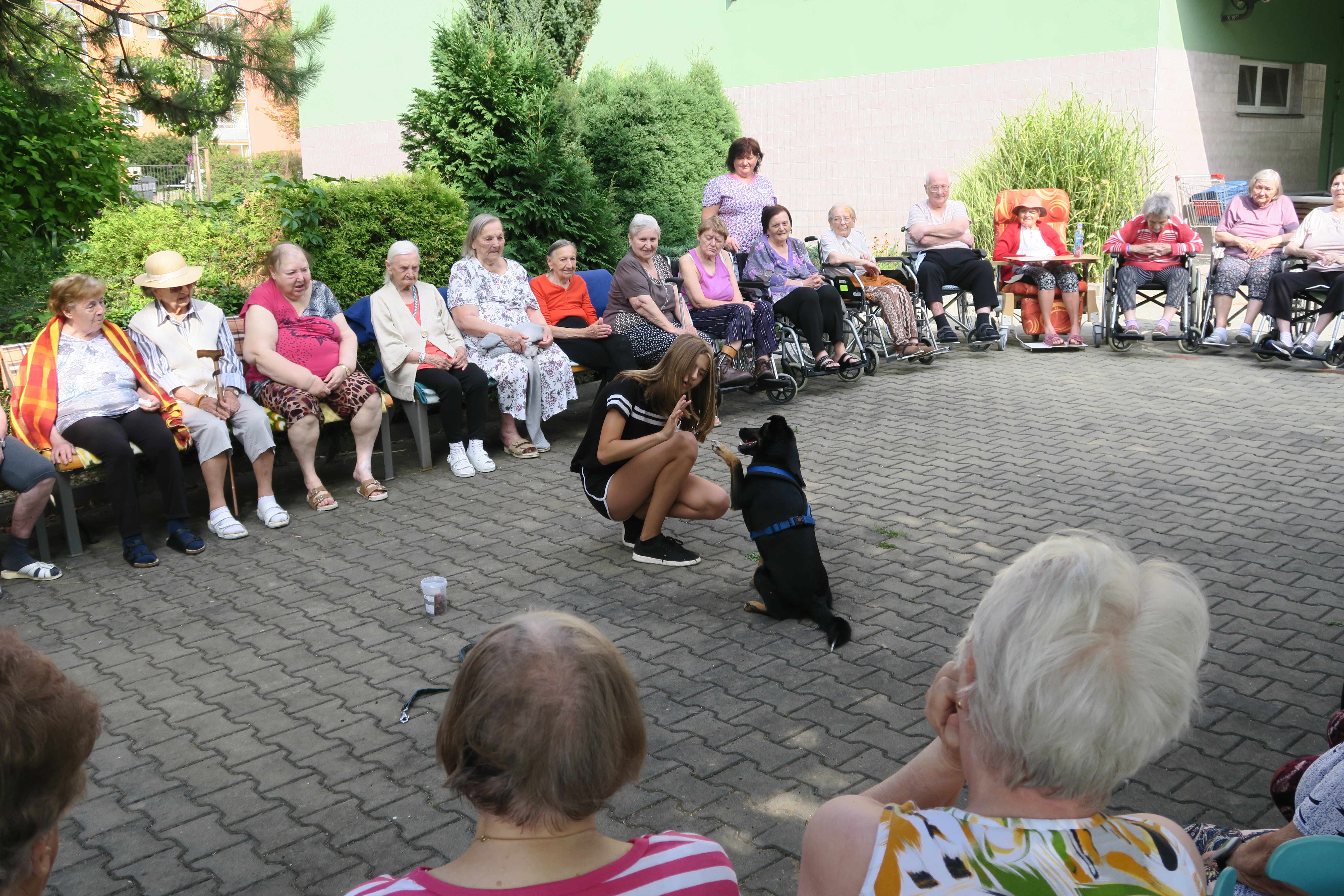 Nejdříve nám Šárka představila svého čtyřnohého miláčka a ze startu si ho mohli naši klienti pohladit a uctít psím pamlskem. Kříženec chodského psa a border kolie chodí 1x týdně na výcvik do Soběšic, kde cvičí agility a poslušnost. Jinak pilně trénuje doma se svou paničkou. Ovládá 117 triků, které úspěšně předváděl naší společnosti v příjemném stínu stromů atria našeho domova. V neposlední řadě se Šárka pochlubila tím, že Akim získal ve „Vořiškiádě“ v Gbelích na Slovensku 1. místo v tricích za stojku na předních nohách, kterou předvedl i našim divákům.