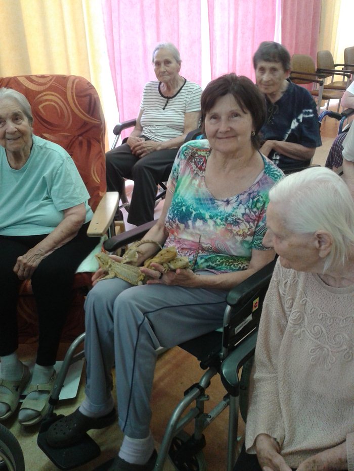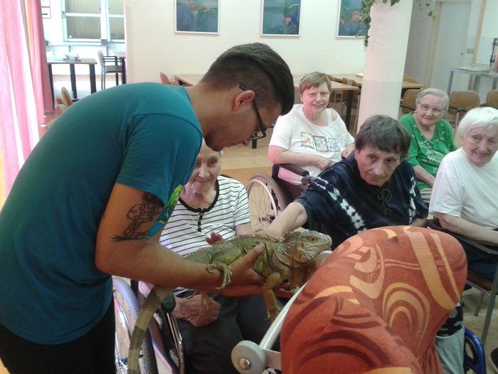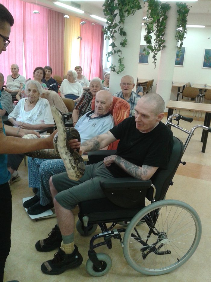 Středu 28. 6. 2017 nám přišel zpříjemnit pan Daniel Filípek se svými zvířecími chovanci. V plánu byla beseda o plazech všeho druhu. Začalo se opatrně želvami. Na ukázku nám Daniel přinesl želvy suchozemské i vodní. K vidění byly mláďata i jejich starší sourozenci. Klienti se dozvěděli zajímavosti o chovu každého druhu, o tom co jedí, jak se rozmnožují a každý se ptal na to, co jej zajímalo. Po želvách přišel na řadu chameleon. Jeho dospělou verzi následovalo jeho mládě, které měřilo cca 5 cm. Všichni si mohli na zvířata sáhnout nebo pohladit. Postupně nám Daniel představil gekona, agamy, varana, který vypadal opravdu hrozivě, a to měřil pouhý 1,4 m. No a na závěr hroznýše královského. Hada škrtiče, který měřil 3 m. Žádný z klientů se nebál a spousta z nich si velkého hada pohladila. Kdo měl zájem, mohl se vyfotit s rodinkou agam na klíně. Celá beseda proběhla bez ublížení na zdraví klientů i zvířat a všichni odcházeli spokojení a plní nových vědomostí a zážitků. Děkujeme Danielovi i jeho mamince za dopoledne v jejich společnosti.