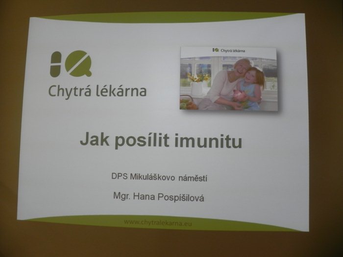 Po krátkém představení paní magistry a jejího kolegy následovala přednáška nejen o prevenci - potřebě posílit svůj imunitní systém a obranyschopnost před virózami, ale i o dalších nemocech souvisejících s chladným počasím. Na pořadu byla také další témata, klientky zajímaly např. problémy s krevním oběhem, křečemi v nohou, cholesterolem a jiné neduhy. Živě se diskutovalo, paní magistra Pospíšilová velmi ochotně odpovídala na dotazy, přítomným klientkám doporučila nejvhodnější moderní léky a zdůrazňovala jako prevenci před nemocemi pohyb, především chůzi. Beseda se klientkám velmi líbila a jako poděkování od nás obdrželi naši přednášející hosté drobné dárky.