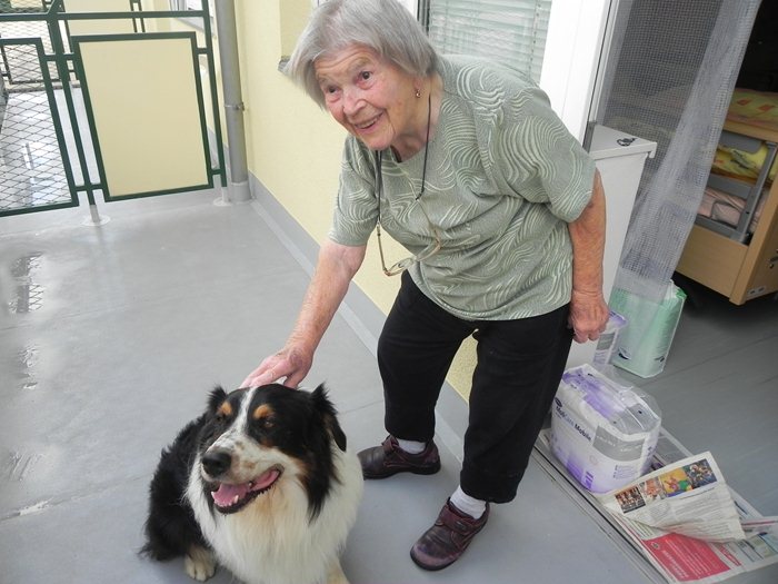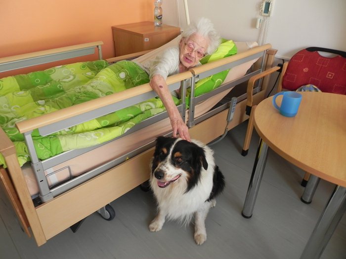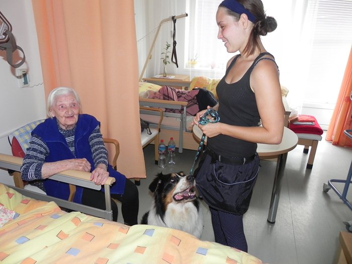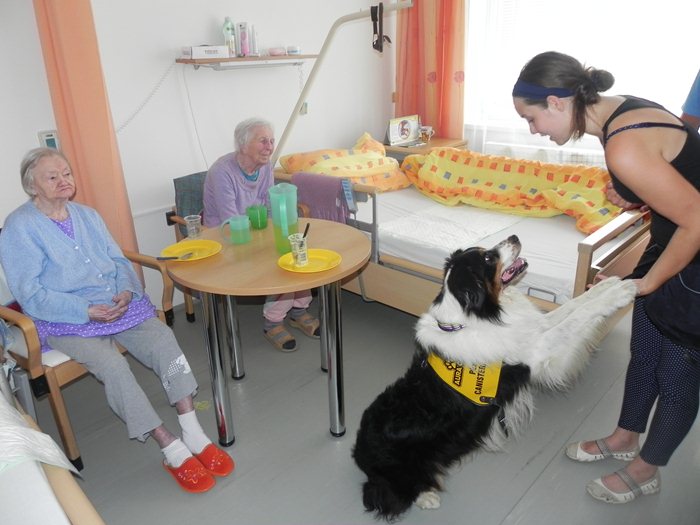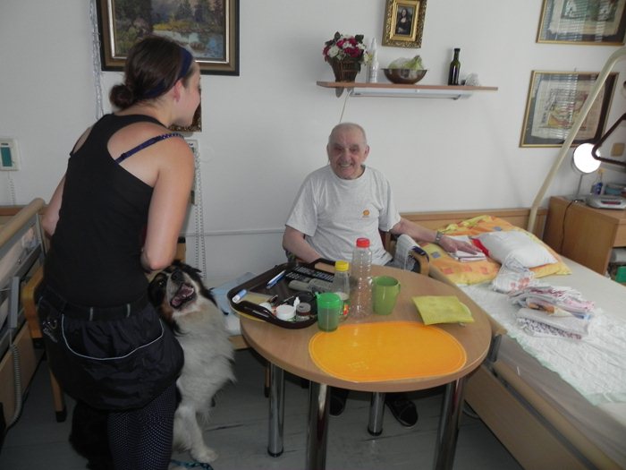 S jejich příchodem se jakoby ihned malinko pozměnil chod domova – všichni, kteří tuhle milou dvojici potkali, se s ní chtěli na chvilku zastavit, promluvit na ně a pejska Atreje pohladit. Samotný Atrej si velký zájem o svou maličkost náramně užíval – doma se totiž cítí být trochu utlačovaný „vinou“ nově narozených štěňátek jeho psí spolubydlící. O to víc tedy rozdával radosti na pokojích klientů. Hned v tom prvním jsme mohli sledovat, jak se oči našich seniorů rozzáří v okamžiku, kdy Atrej jako vzácná návštěva vkročí do místnosti. Jelikož ho s jeho paničkou Denisou čekají příští týden zkoušky, kde bude předvádět celou řadu z triků, které ovládá, mohl si je před zdejším užaslým obecenstvem dobře procvičit. Pokoj po pokoji jsme pozorovali, jak Atrej skvěle plní svou funkci – a to hlavně vytvořit úsměv na tvářích těm, kterým třeba v tu danou chvíli do smíchu úplně nebylo. A Denisa mu v tom zdatně sekundovala, nezdráhala se vést nenucené rozhovory s každým, kdo o povídání stál. Už teď je, myslím si, většině osazenstva domova po Atrejovi smutno a těší se, až zase v brzké době dorazí.