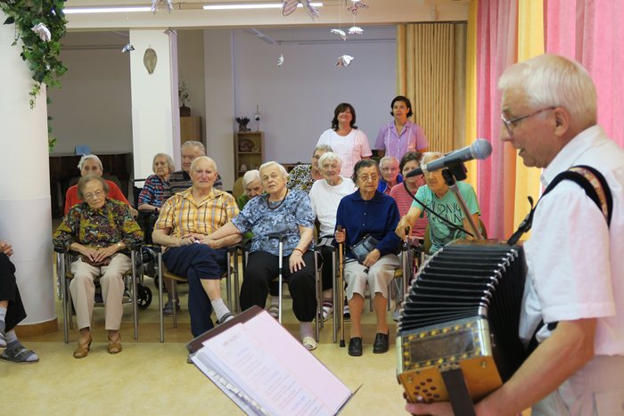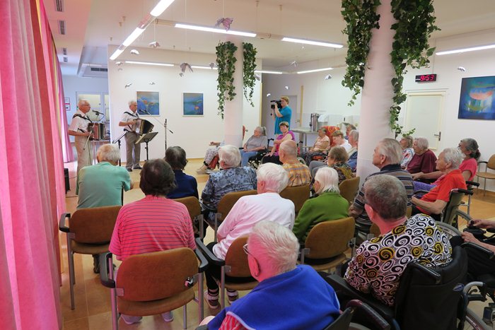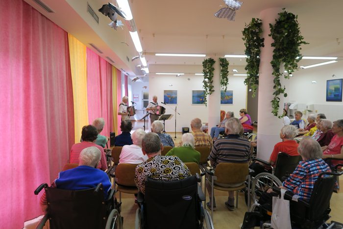 Protagonisté zahráli lidové písně z Čech a Moravy. Z písní na přání nechyběla píseň „Ta naše písnička česká“, Masarykova oblíbená – „Teče voda, teče“, „Červená sukýnka“ a „Cikánko ty krásná“. Klienti si prozpěvovali a u mnohých, zvláště u písniček na přání se zalesklo nejedno oko. Rozloučili se s námi písní „S pánem Bohem idem od vás“ a určitě si zaslouží všichni účinkující velké poděkování.
