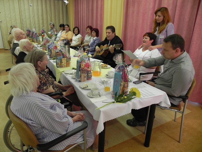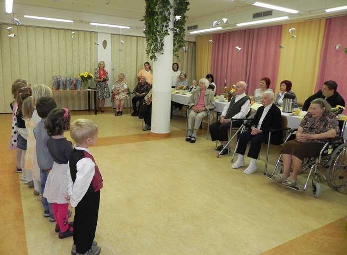 Pěvecké vystoupení dětí z MŠ Elišky Přemyslovny uvedlo a zpestřilo program gratulace. Dětské hlásky vykouzlily upřímné úsměvy na tvářích všech zúčastněných. Následovala gratulace pana starosty Mgr. Vladana Krásného a Márie Liptákové z ÚMČ Starý Lískovec. Nechyběla květina a dárkový balíček. Pevným stiskem rukou a upřímnými slovy vyjádřilo přání všeho nejlepšího oslavencům i vedení našeho domova. Pan starosta nás za doprovodu kytary vnesl do světa hudby. Společně jsme si zazpívali písně různých žánrů. Oslava probíhala ve velmi příjemném duchu. Dobrou atmosféru umocnilo také výborné pohoštění z naší kuchyně. Gratulace se vryla do paměti klientů a potěšila jejich duši. Na další oslavu se můžeme těšit na konci letošního roku.