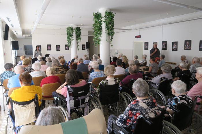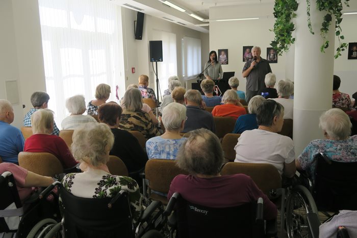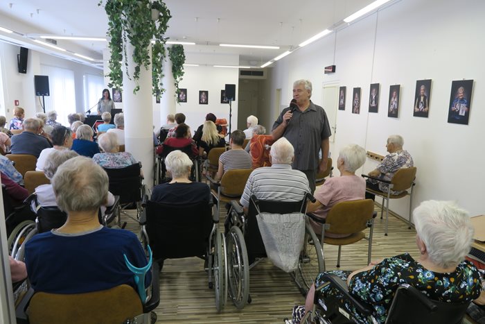 Hudební odpoledne nemohlo začít ničím jiným než písničkou „Jedna bílá orchidej“ a pak už následovali lidové i trempské písničky, které k létu a prázdninám neodmyslitelně patří. Všem dobře známé písničky si zazpívali klienti i jejich rodinní příslušníci či známí, kteří je na tuto akci rádi doprovázeli. Některým se zaleskla slza v oku při vzpomínce na mládí a tancovačky. Krásné odpoledne zakončila paní Eva písničkou „Ave Maria“. Příznivci tohoto dua byli nadmíru spokojeni a těší se na další setkání.