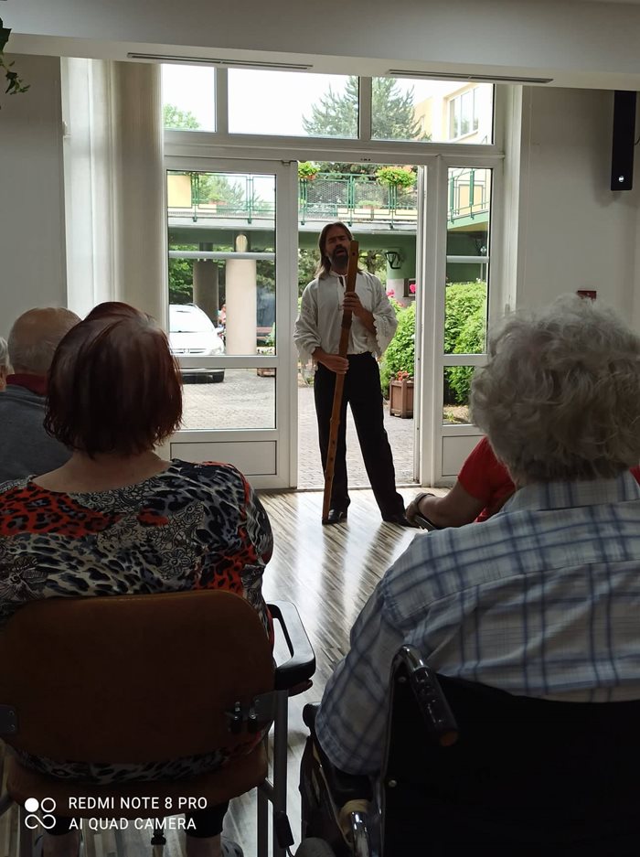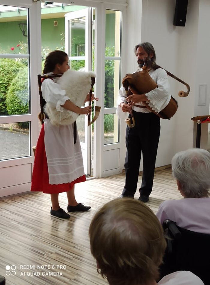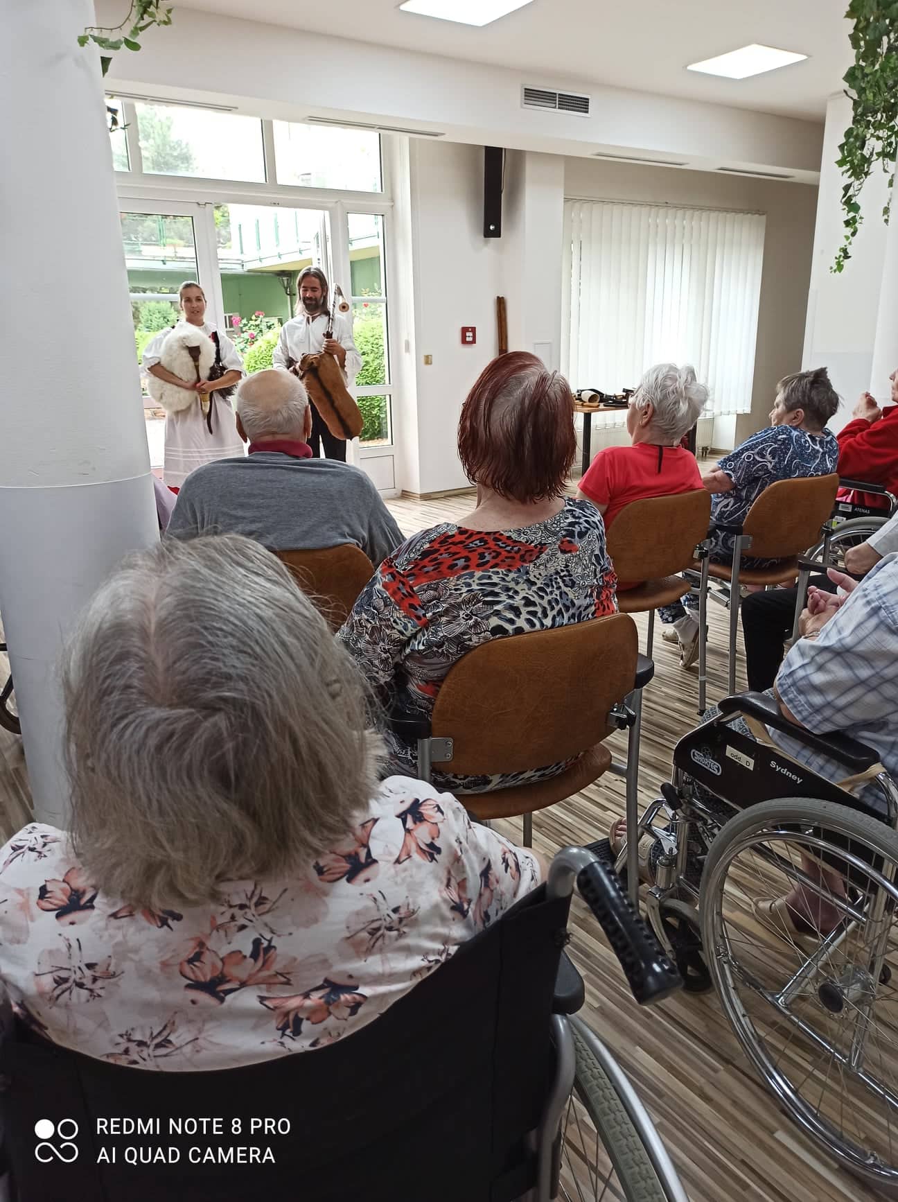 Po dvou letech nás opět navštívili Dudáci. Mladý manželský pár, za zvuku skotských dud, vpochodoval z atria domova do společenské místnosti, kde na ně čekali klienti. Senioři je přivítali srdečným potleskem. Uvítací písní „Žádnej neví co jsou Domažlice“ se společně rozezpívali a podupávali do rytmu. Zahráli na svatební a holandské dudy. Představili atypické chorvatské gajdy se čtyřmi hlasy, které jsou známé především pro oblast Pálavy, kde sídlili Moravští Chorvati. Královna píšťal fujara z černého bezu, připomínala svatojánský čas a ponocenský roh, dechově náročný nástroj, přenesl mnohé do doby, kdy ponocný oznamoval večerku.