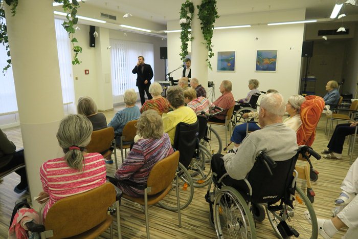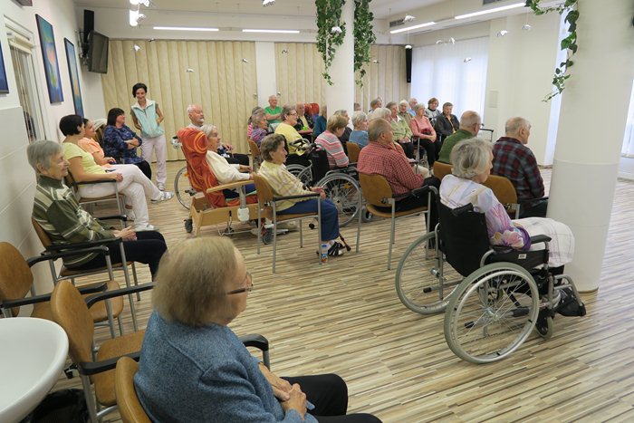 V naší společenské místnosti tak měli možnost zaznít písně z repertoáru Karla Gotta, ale-i stálice lidových písní jako Morava, krásná zem nebo když jsem šel z Hradišťa. Klienti si společně zazpívali a prožili dopoledne s hudbou na rtech i v srdci. Na závěr jsme aktérům popřáli, aby měli zaplněné sály a v hrdle zlatého slavíka i nadále stejně jako Karel Gott.
