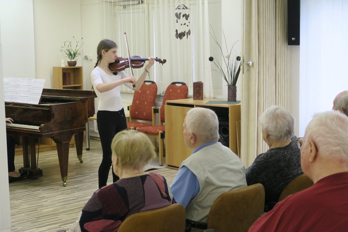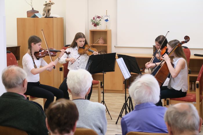 Tentokrát v programu zazněly skladby A. Dvořáka, F. Seitze, O. Reidinga, Ch. Dancla a F. Mazase v podání žáků na violy, housle a smyčcového kvarteta. Jako vždy celým programem prováděla paní učitelka Vojtková, která kromě informací o skladbách a jejich autorech přidala i informace o způsobech studia a úspěších jejich studentů. Vzhledem k tomu, že v minulém týdnu proběhl velký koncert žáků školy v Besedním domě, ze kterého je pořízen videozáznam, nabídla nám možnost zapůjčení ke zhlédnutí. Tuto nabídku jsme rádi přijali a promítání zařadíme do prázdninového programu.