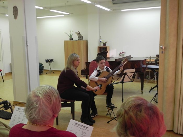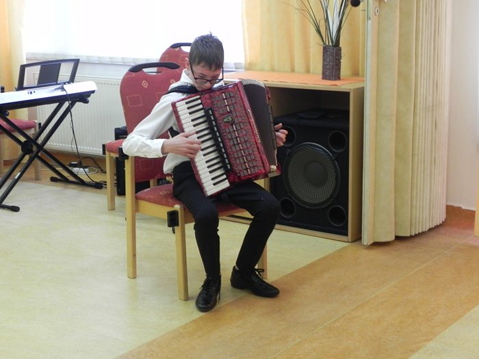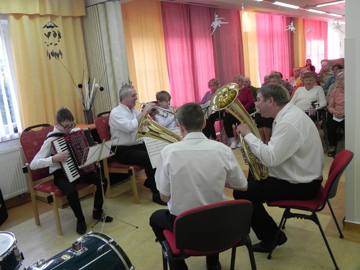 Dne 18. 1. 2017 jsme s radostí opět přivítali naše milé hosty, žáky i jejich učitele ze ZUŠ Františka Jílka, a zahájili letošní koncertní sezonu. Naši klienti si poslechli díla vybraných hudebních skladatelů, mezi něž se řadili: T. Stachak, D. Aguado, Š. Rak, F. Molino, M.Giulliani, M. Tesař, C. Debussy, F. Seitz, J. V. Kalivoda, W. A. Mozart, Y. Tiersen, V. Bláha, J Řepa; dokonce zaznělo i dílo anonymního autora a jedna lidová v podání různých hudebních nástrojů: klavír, kytara, viola, housle a akordeon. Dopolední matiné uvedla a vystoupením posluchače provázela paní učitelka Hana Vojtková. Na závěr dnešního koncertu si pro nás připravil malý dechový soubor překvapení – 3 skladby: „Muzikanti, pojďte hrát“ od V. Bláhy, lidovou: „Stará lípa“ a skladbu „Ta naše kapela“ od J. Řepy. Koncert se velmi líbil a klientům roztančil kolena. Už dnes se těšíme na 8. března, kdy nám přijedou naši vzácní hosté opět zahrát.