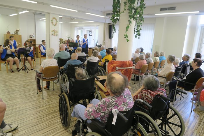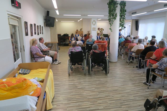 Ve středu 5. června proběhl koncert dechové hudby žáků ZUŠ Fr. Jílka pod vedením pana učitele Josefa Rapáče. V tomto čase závěrečných zkoušek a písemných prací nebylo vůbec jednoduché poskládat dechovou hudbu tak, aby byla v plném počtu. Přesto se to povedlo a dechová hudba zahrála a sourozenecké duo zpěváku zaspávalo písničky jako „Ta naše kapela je veselá“, „Plavala husička po Dunaji“, „Ta slepička kropenatá“ a další. Dechovka je žánr, který patří mezi našimi klienty k nejoblíbenějším. Proto je zřejmé, že toto hudební dopoledne vneslo veselou náladu a příjemnou atmosféru do našeho domova nejen po dobu konání koncertu, ale ještě dlouho po jeho skončení. Nyní můžeme čerpat z krásného zážitku a těšit se na zahajovací koncert příští sezóny.