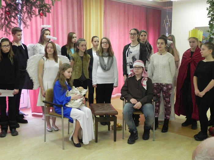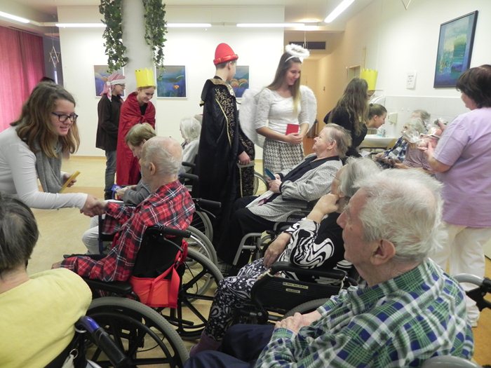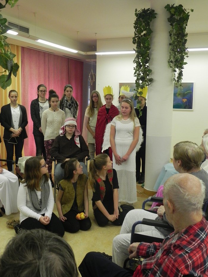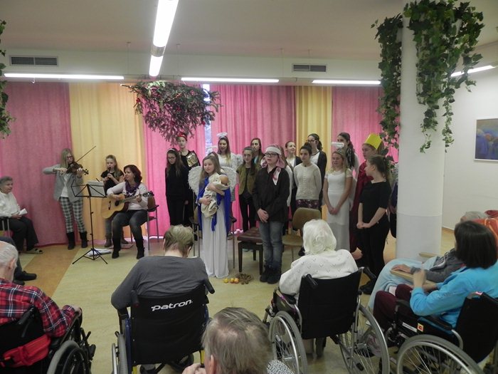 Jedno takové jsme prožili v našem domově společně s dětmi ze ZŠ Bakalovo nábřeží. Děti společně s pedagožkou Lenkou Přikrylovou připravily pro naše klienty divadelní vánoční hru se zpěvy. Díky nim jsme se přenesli do děje legendy o narození Ježíška. Byli jsme svědky, kdy Josef s Marií odchází do Betléma ke sčítání lidu; kdy andělé zvěstují radostnou zprávu; kdy přichází tři mudrcové a pastýři, až po slavné narození děťátka. Vánoční hra byla provázena krásnými zpěvy a hudebním doprovodem. Na závěr programu děti naše klienty obdarovaly vánočními přáníčky a s přáním všeho nejlepšího k vánočním svátkům a do Nového roku se s námi rozloučily těmi nejznámějšími a nejkrásnějšími koledami, které jsme si všichni s chutí společně s dětmi zazpívali.
