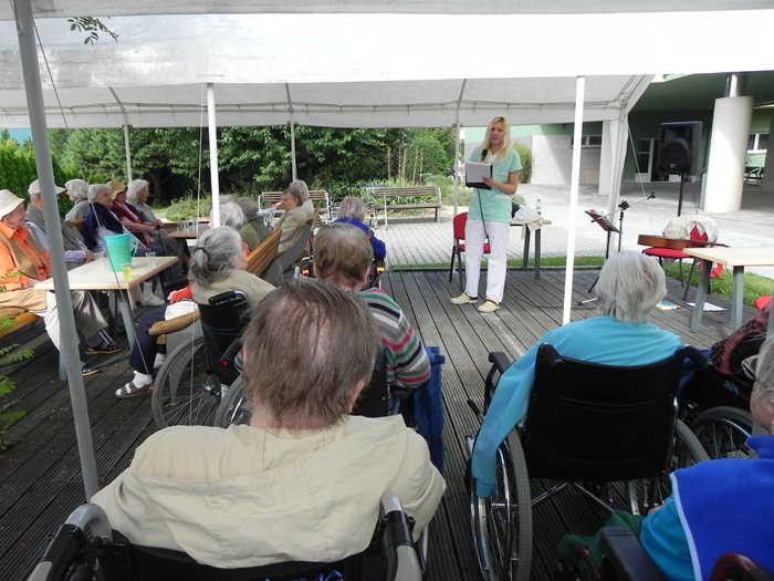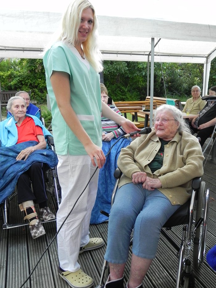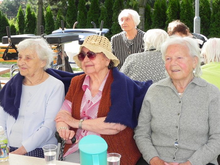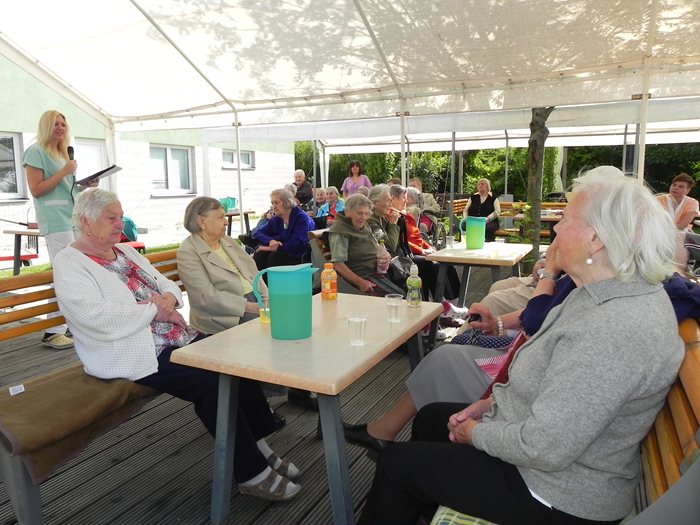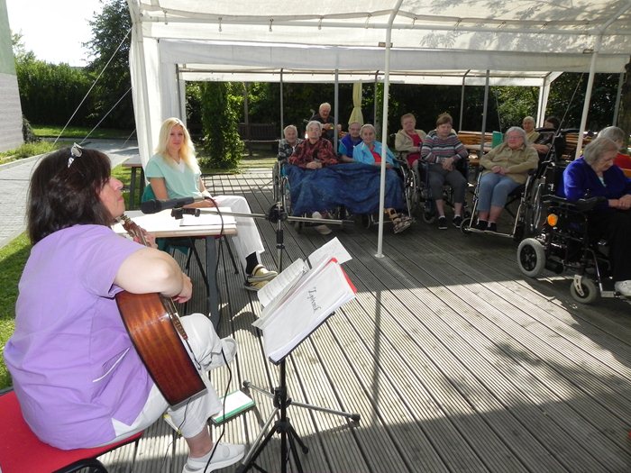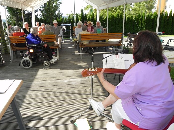 V příjemném a uklidňujícím prostředí zahrady, kryti před ostrými slunečními paprsky ve stínu párty stanu jsme si zorganizovali „sousedské“ posezení se svými přáteli a známými. Na programu bylo společné zpívání nejznámějších lidových písní, tematicky rozdělených do několika skupin – na písně vojenské, písně o koních, o zahrádkách, květinách a sázení; a písně s ptačí tematikou. Klienti s velkou chutí zpívali a sami mnohdy navrhovali názvy písní, které potom zazpívali. Dalším bodem programu byl soutěžní písničkový kvíz, ve kterém nás čekalo 20 otázek ohledně znalosti obsahu a příběhu textů lidových písní. Tento kvíz prověřil znalosti a paměť nás všech zúčastněných. V některých klientech probudil zdravou soutěživost, mnozí se předháněli se správnými odpověďmi. Dále se pokračovalo ve zpívání a došlo i na písničková přání. Připravený program se klientům velice líbil se slovy, že by bylo škoda si ho znovu nezopakovat. Takže, příště zase na viděnou!