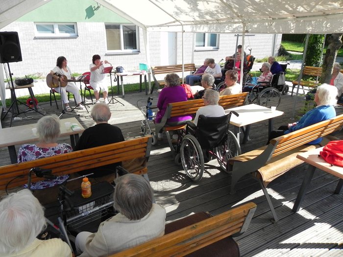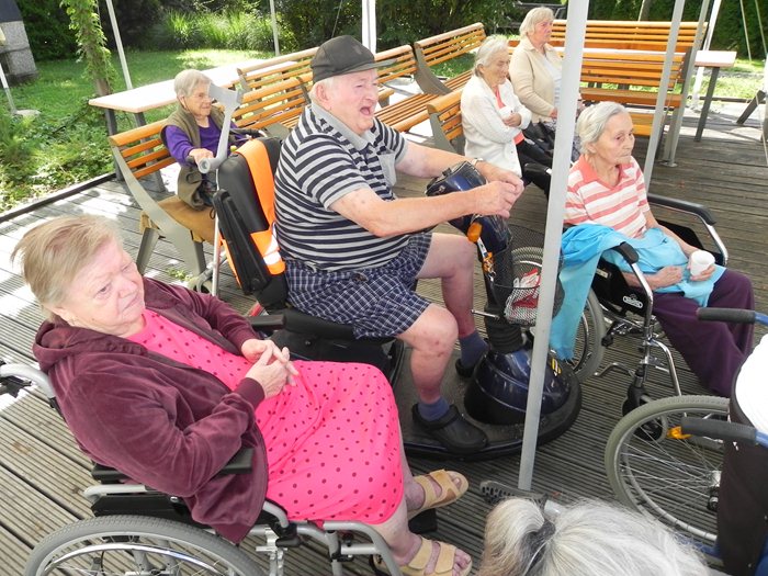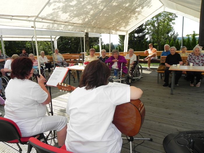 Společně s klienty našeho domova jsme se opět sešli pod párty stanem a zahájili v pořadí druhou letní párty. Program akce spočíval ve zpívání známých písniček, které si mnohokrát broukáme během všedního dne. Naše klienty jsme překvapili i tréninkem paměti a zalovili jsme ve vzpomínkách po lidových písničkách z mládí našich babiček a dědečků. Využili jsme tak hezké srpnové počasí, tvář jsme nastavili slunečním paprskům a s chutí jsme hádali názvy jak písniček, tak i znělky pohádek z Večerníčka. Už teď se připravujeme na poslední srpnovou středu, kdy si letní párty zopakujeme.