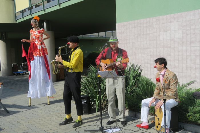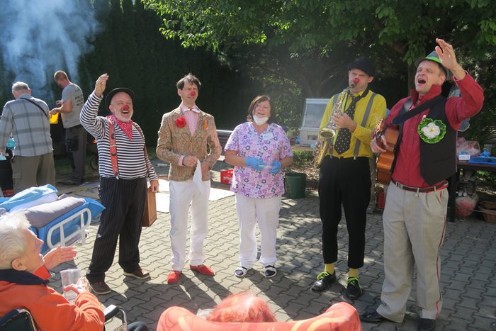 A co by to bylo za zahradní oslavu, kdyby chyběla pořádná kapela? O zábavu a veselé písně se tedy postarali naši stálí spolupracovníci Zdravotní klauni, kteří vykouzlili úsměv na tváři nejenom klientům, ale i všem účastníkům akce.