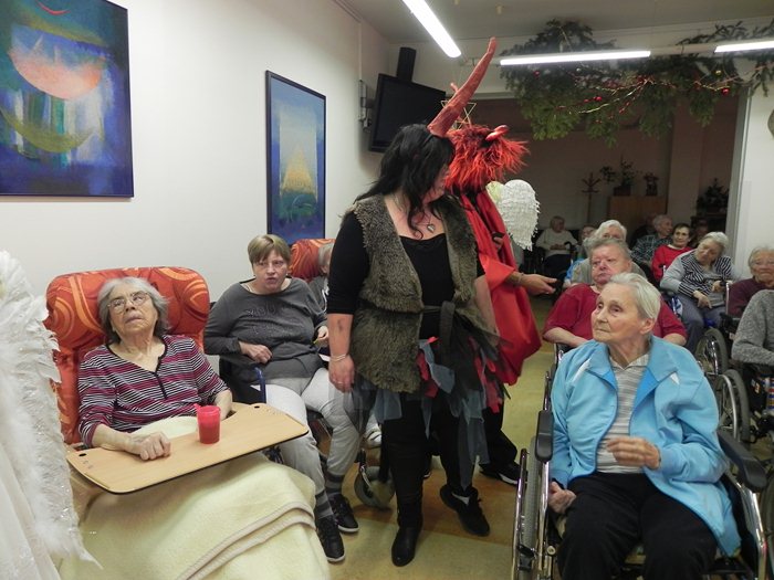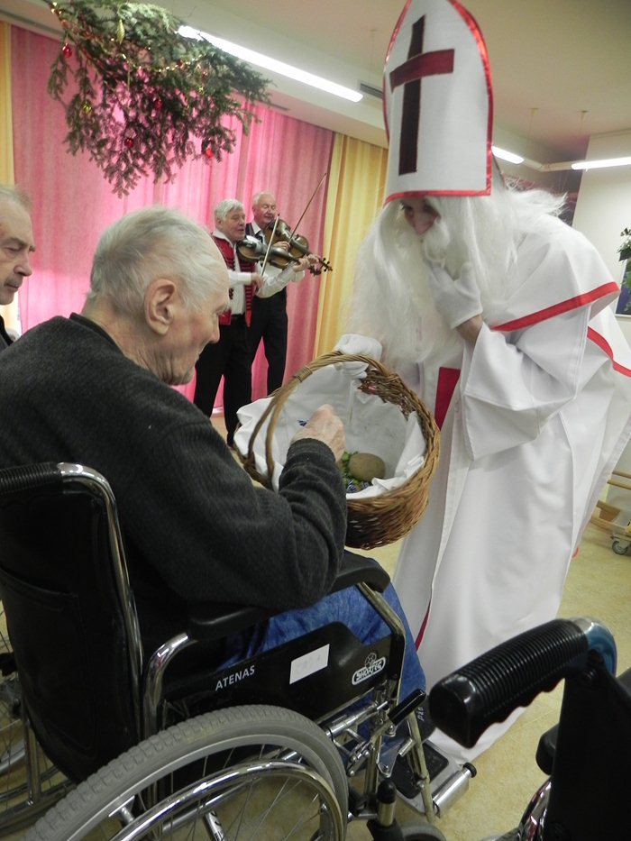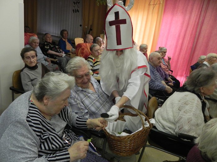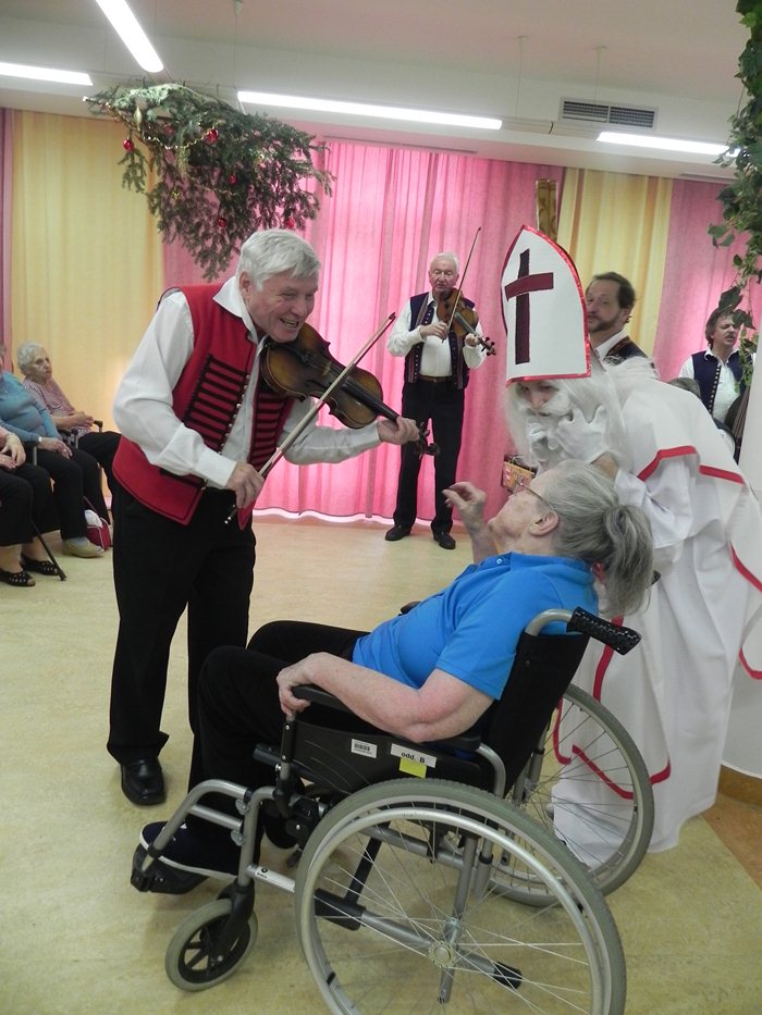 Dne 6. 12. 2016 nás v odpoledních hodinách poctila svou návštěvou hudební cimbálová skupina Fujárka, jejíž koncert se konal ve společenské místnosti našeho domova. K písničkám se přidávali se svým zpěvem také naši klienti. V první části hudebního programu nás přišel navštívit Mikuláš se svou družinou. Společně s anděly přinesl klientům dárečky, mezi kterými si mohli dle svého vědomí a svědomí vybrat. Na výběr byly kromě dárečků také brambory a uhlí. Každý klient si mohl vzít od anděla perníček. Snad největší úspěch sklidil psí andílek, border kolie Brittuška, která byla součástí početné Mikulášovy družiny. Brittuška se svou paničkou tancovala na muziku a procházela se mezi klienty, kteří si ji velmi rádi pohladili. Na závěr dnešního hudebního odpoledne mohli nejen klienti, ale i jejich rodiny a přátelé zhlédnout světelnou show v podání našeho vždy vítaného hosta, Vendulky. Všem přítomným se tato akce velmi líbila, nabila je optimismem a dobrou náladou, proto se všichni těšíme, až si ji příští rok zopakujeme.