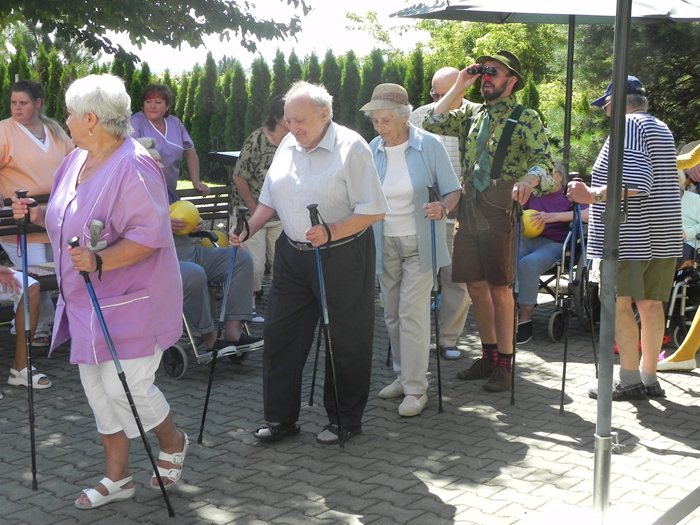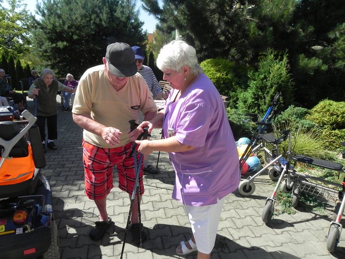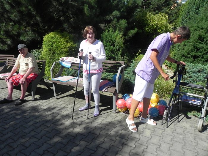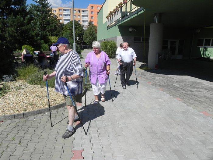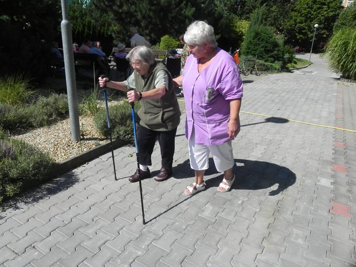 V tento den obvykle probíhá sportovní pásmo Fit senior, které zahrnuje cvičení například s činkami, balony, nebo trekingovými holemi. A právě hole přišly na řadu v pátek jednatřicátého. Většina z klientů nikdy tyto speciální hole nepoužila, panovala proto všeobecná nejistota, která ovšem patří ke všemu neznámému. Tím se ale naše milá fyzioterapeutka Inka nenechala zastrašit. Svou přirozenou autoritou klientům ukázala, že chůze s těmito holemi je příjemná, pohodlná, a co víc, poskytuje tělu tolik důležitou oporu a stabilitu. Nakonec nám někteří jedinci dokázali, že je nordic walking začal vyloženě bavit, o čemž svědčí i dotazy na to, kdy se tato aktivita vrátí znovu na program.