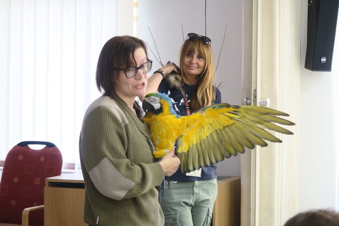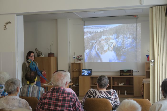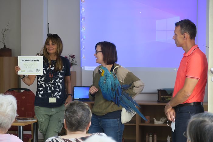 Neváhali jsme ani letos, vybrali jsme finanční částku a přispěli tak na chov papouška. Ve středu přijely pracovnice ZOO Brno do našeho domova, kde byla podepsána adopční smlouva a předán finanční dar. Nechyběl ani barevný opeřenec, který jako vždy přivítal zúčastněné hlasitým pokřikem a poklonkami. Společnost ze zvířecího světa mu dělala fretka, morčata a králíci, kteří skončili na klínech pod rukama našich klientů a společně si to užívali. Nechyběla také krátká videoprojekce, novinky ze ZOO a spokojenost na obou stranách. Jsme rádi, že lhostejnost a láska k těmto „němým“ tvorům nás nenechává chladnými.