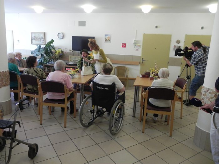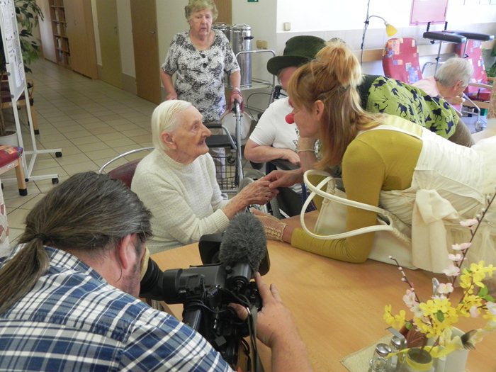 A protože se působení klaunů v zařízeních pro seniory ještě nedostalo do povědomí široké veřejnosti, vzala si toto téma na svá bedra Česká televize. Poslední červencový den dorazil reportér Martin Vodička spolu s kameramanem ČT do prostor domova na Mikuláškově náměstí s posláním vytvořit krátký spot do televizního pořadu Události v regionech. Ve spolupráci s PR koordinátorkou Zdravotních klaunů paní Kateřinou Procházkovou proběhlo během onoho dopoledne natočení několika záběrů. Kamera zachytila jednak vystoupení klaunů na oddělení B, tak jejich očekávanou návštěvu na pokojích, či závěrečné rozloučení na zahradě domova. Natáčení pro televizi bývá mnohdy hektické a plné zmatků, naše páteční natáčení ale proběhlo v klidném duchu, a to také díky vstřícnému jednání televizního štábu a zástupců Zdravotních klaunů.