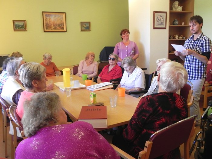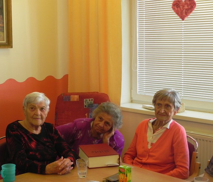 Ve společenské místnosti se sešlo nezvykle mnoho zájemců o dopolední zábavu, až jsme museli přidávat další židle. Začali jsme dobře známým procvičováním mozkových závitů v podobě slovního fotbalu a následně i prostřednictvím hry na hádání povolání. Libuška už minule slibovala, že přinese Bibli, a tak z domova přivezla jednu sedmikilovou židovskou z roku 2010. Směr, kterým se rozjetá zábava ubírala, se změnil v okamžiku, kdy na dveře někdo zaklepal. Výborné „entrée“ nám předvedl velmi vzdělaný mladý muž, Jakub Volf, který při vstupu do místnosti nejprve musel sesbírat své na zem spadené věci a teprve potom všechny rozpačitě pozdravil. Nezdráhal se pomoci při rozdávání papírků s úkoly a po dokončení programu se pustil do přislíbené přednášky. Téma Bible je velice rozsáhlé a ideálně by mělo být prezentováno na více částí, proto jsme se rozhodli, že pokud by se Jakubovi nepovedlo nás opět navštívit v budoucnu, bude rozumné mluvit o obecném významu, rozdělení a problematice historicity Bible. Celá přednáška trvala asi hodinu a půl a klientky se po tu dobu snažily vstřebat opravdu velké množství informací, názorů a zajímavostí, kterými je mladík neustále zahrnoval. Fakt, že ochotně a rád odpovídal na občasné dotazy, nás přesunul i daleko mimo vybrané téma, ale podle zpětných vazeb klientek v podobě diskuze v keramické dílně tím byly spíše nadšeny. Pozdější přiznání o slzách „na krajíčku“ snad dostatečně vypovídá o úspěšnosti návštěvy.