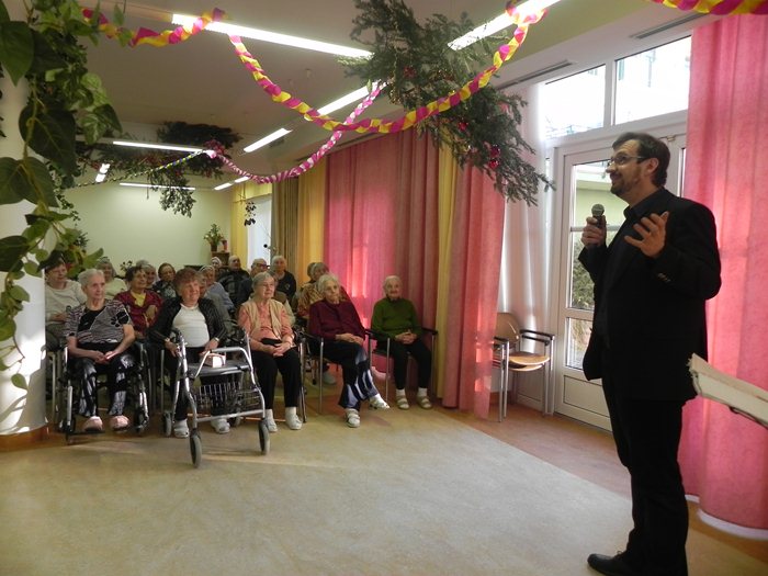 Umělec Šimon Pečenka se s našimi klienty setkal ve společenském sále, kde první blok svých písní věnoval písním Osvobozeného divadla, Karla Hašlera a Oldřicha Nového. V dalších blocích zpíval písně Milana Chladila; z jeho písní nám interpretoval např. známou píseň „Hello Mary-Lou“, známý duet s Yvetou Simonovou, nesoucí název „Sladké hlouposti“ či „Děti z Pirea“. Klienti se často nechávali unášet známými melodiemi a často také sami zpívali či tleskali do rytmu. V druhém až čtvrtém hudebním bloku umělec předvedl také známé muzikálové písně jako např. Hello Dolly, kterou nazpívala naše vynikající zpěvačka Laďka Kozderková, či známý muzikálový šlágr „Já se dnes odpoledne žením“ z muzikálu My Fair Lady. V meziprostoru umělec nezapomněl taktéž zmínit humorné zkazky ze života interpretovaných umělců, často doprovázené rovněž i historkami ze života svého; umělec se veskrze vyznačoval charismatickým rétorickým přednesem. V posledním bloku nezapomněl také charismaticky interpretovat některé z Gottových písní jako např. „Oči má sněhem zaváté“ či „Lady Karneval“ či písně Matuškovy jako např. oblíbenou „Slavíci z Madridu“. Nakonec celý koncert uzavřel písní Erose Ramazzottiho v českém podání, kterou věnoval všem zaměstnancům našeho domova, neboť si uvědomuje, že oni tvoří nedílnou a nezbytnou součást domova; popřál rovněž i našim klientům všeho dobrého a především, aby se jim i nadále dařilo udržovat si svoje zdraví a vitalitu jako doposud. Klienti si koncert velmi pochvalovali a již se těší na další návštěvu Šimona Pečenky.