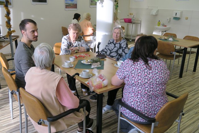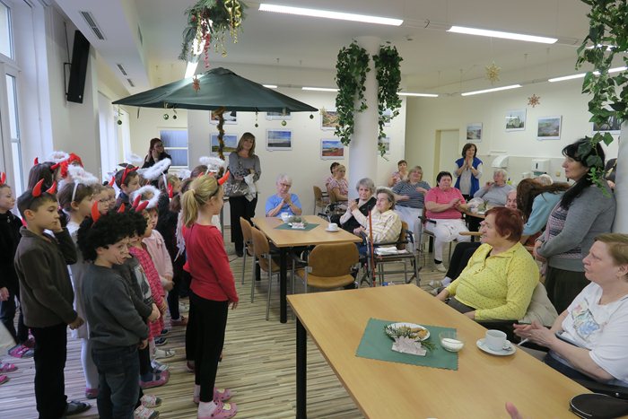 Společenská místnost domova se proměnila na jarmareční trh. K mání byly nádherné výrobky z keramické dílny DSM - ryby, andělé, mísy, hrníčky, svícínky, a spousta dalších věcí a dekorací z keramiky. Návštěvníci z řad klientů, příbuzných a hostů zvenčí si mohl z jarmarku odnést i ručně vyráběná mýdla, soli, polštáře s levandulí a další drobnosti vyráběné v domově. Koukat se bylo opravdu na co. A nezůstalo jen u obdivování a nakupování. Přítomní mohli také ochutnat vánoční punč nebo svařák, vánoční perníčky a cukroví vyráběné v DSM a nakonec si i zazpívat známé i málo známé koledy. Všem, kteří se podíleli na pořádání jarmarku, mnohokrát děkujeme a stejně tak děkujeme všem, kdo přišli náš jarmark navštívit, a těšíme se opět na setkání v příštím roce!