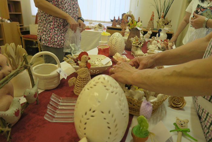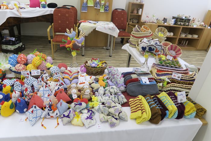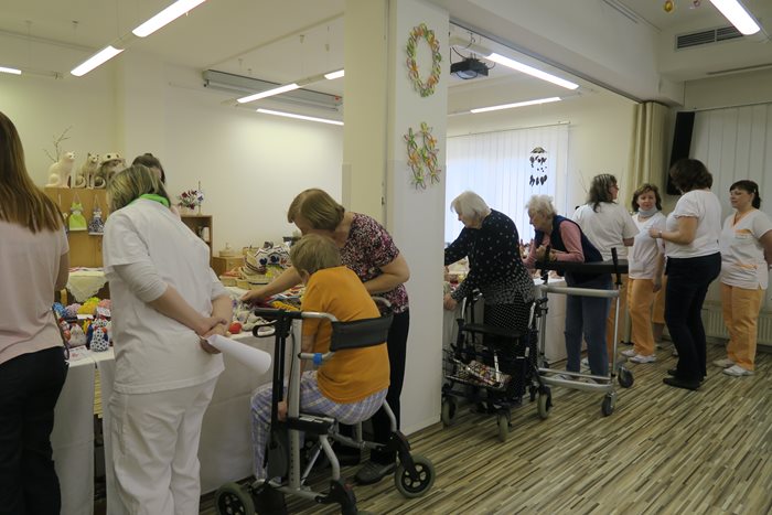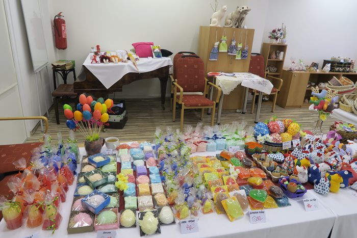 Náš již tradiční Velikonoční jarmark mohli navštívit nejen naši klienti, ale i jejich přátelé, rodina a zaměstnanci. Vybrat si mohli z nejrůznějších výrobků pocházejících z našich ergoterapeutických dílen, jako například výrobky z keramiky, šité dekorace, pletené ponožky a papuče, košíky z pedigu, mýdla, šumivky, koupelové soli a svíčky. Na jarmarku nechybělo ani občerstvení kávou, čajem, mazancem a piškotovým beránkem. Příjemné posezení zpříjemňovala hudba a filmy.