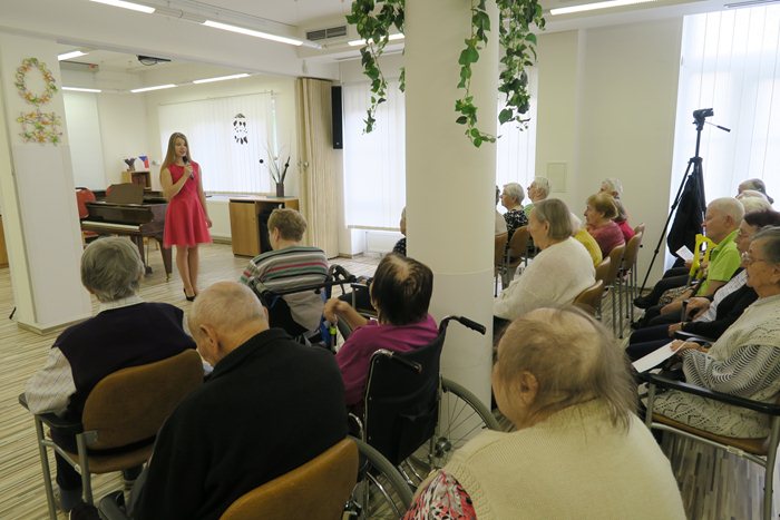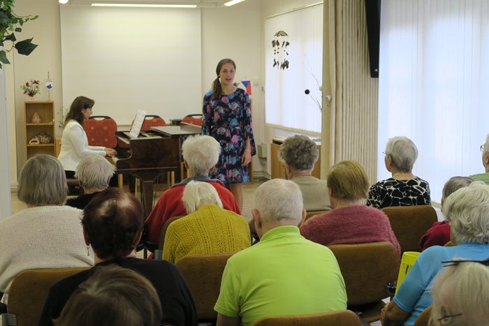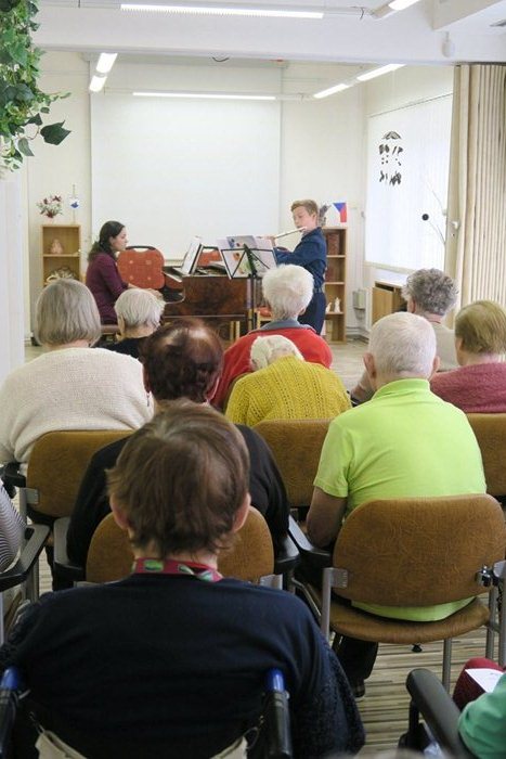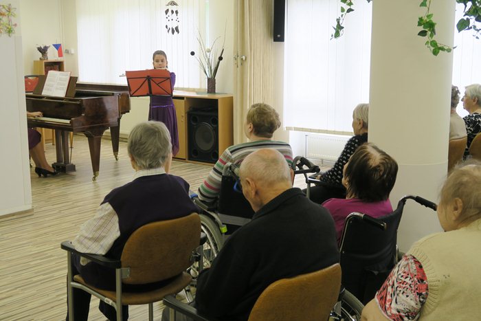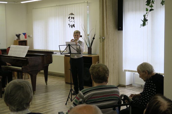 Koncert začínal zpěvem písní od B. Martinů L. Janáčka v podání Anežky Čalkovské. Talentovaná žákyně 3. ročníku II. st. se s tímto repertoárem chystá na soutěž do Prahy. Po krásném zpěv následoval dramatický přednes. Baladu Toman a lesní panna od Fr. L. Čelakovského bez jediného přeřeknutí odrecitovala Karolína Vašková. Poprvé v našem domově se klientům představila malinká Sofinka Kozánková hrou na klavír a také ona se připravuje na soutěž Amadeus. Klavírní vystoupení střídalo dechové vystoupení na zobcové a příčné flétny mladých umělců. Celý koncert ukončila krásným pohlazením v pěveckém číslu Anežka Čalkovská.