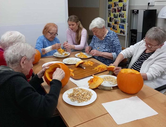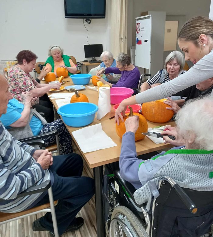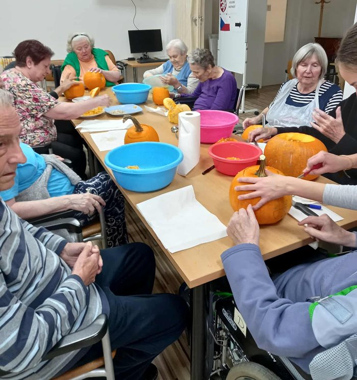 Dnes bylo všechno oranžové :-) Čistili jsme, vybírali semínka a vyřezávali roztodivné tvary do připravených dýní. Výsledek našeho tvoření jsme vystavili po našem domově a zahradě.
