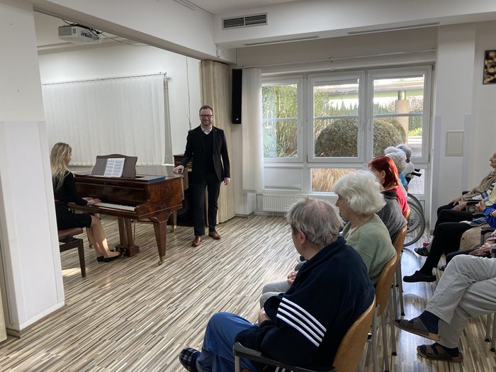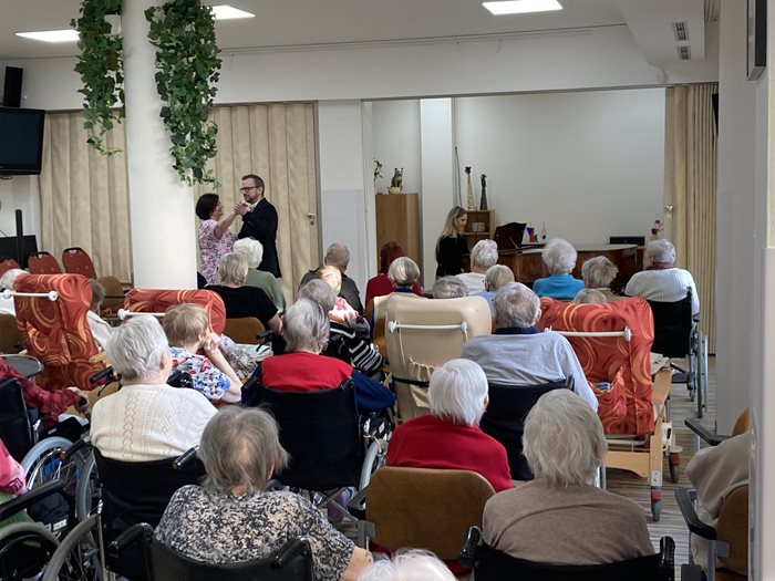 Ve středu 1. března 2023 k nám po třech letech opět zavítala tvůrčí dvojice z Divadla 2-15 David Kříž, který je nejen zpěvák a autor písní, ale také ředitel a pedagog a Lucie Kubátová, výborná klavíristka Národního divadla v Brně. Potěšili naše klienty písněmi z Osvobozeného divadla, divadla Semafor a také z vlastní tvorby Divadélka 2-15. Zazněly písničky od Jana Wericha a Jiřího Voskovce, také od Jiřího Suchého. Klienti nejen že zavzpomínali na své mládí, ale také se ke zpěvu přidali. Celé vystoupení vládlo velmi příjemnou atmosférou.