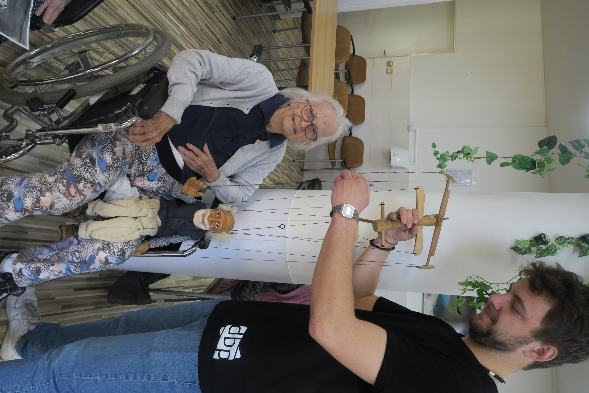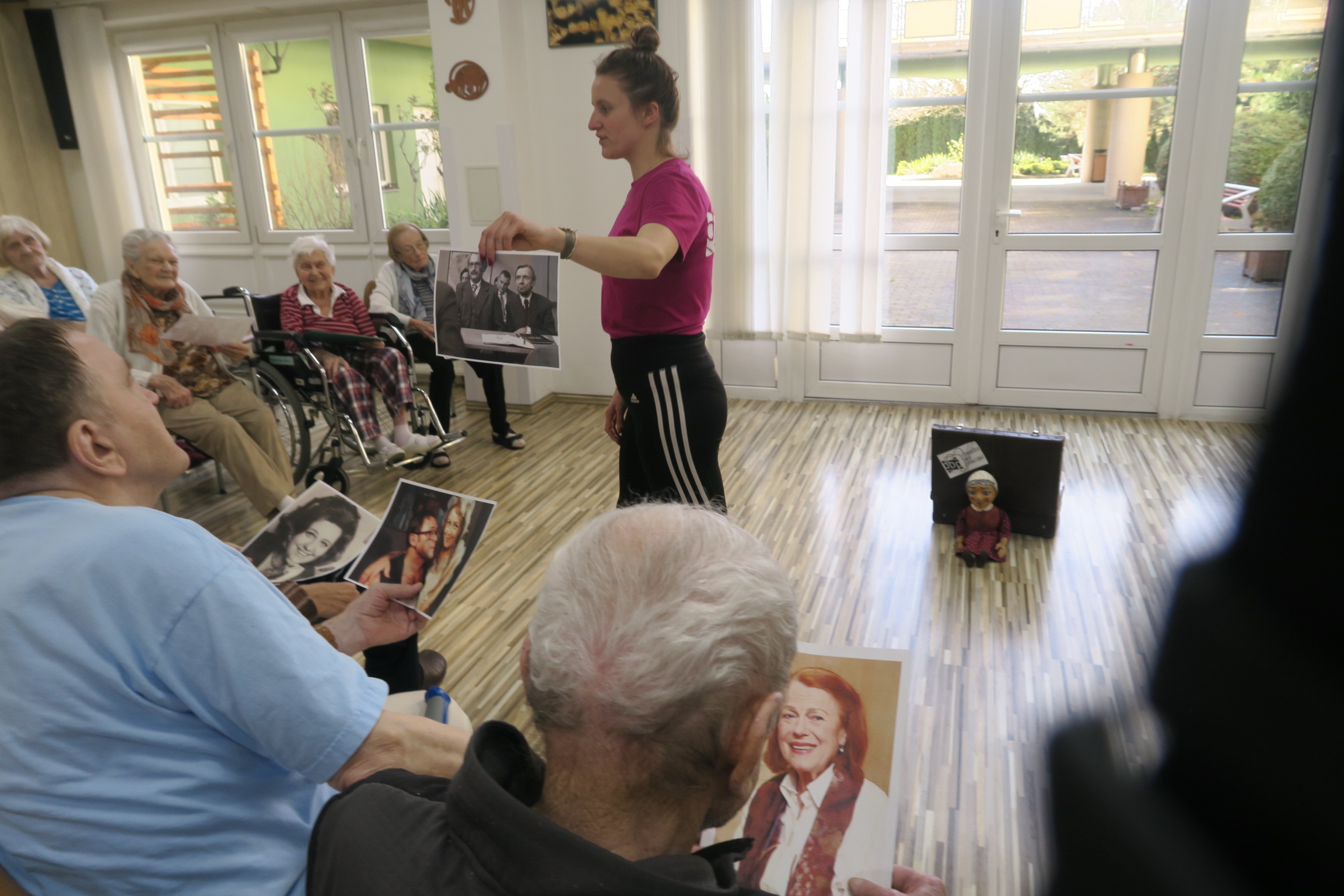 Středeční návštěvou mezi nás po roce zavítalo s programem „Naši filmoví herci 60. – 70. let. Dva mladí herci se s loutkami dědy Josefa a babičky Růženky představili a přivítali s každým klientem zvlášť. Krásné loutky posedávaly na jejich klíně, společně si povídali a smáli se. Loutkoherci rozdali seniorům fotografie známých herců z dob jejich mládí a každý z nich měl uhodnout jméno nebo v jakém filmu si zahráli.