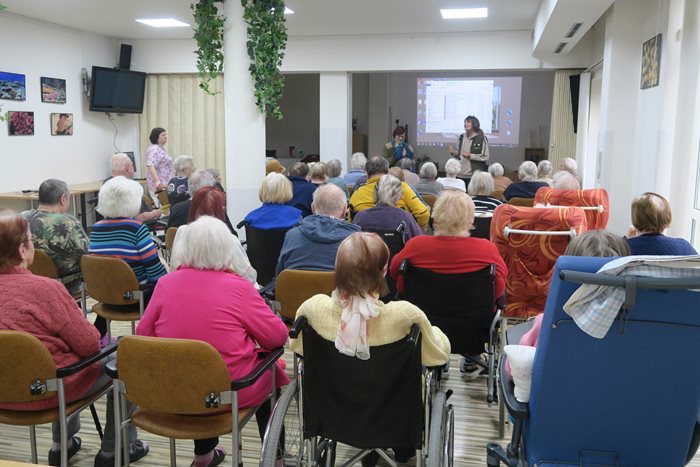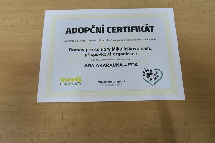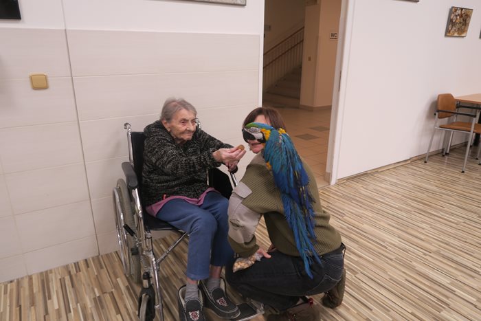 Každoročně nás navštěvuje papoušek Eda z rodu Ara Ararauna, kterého jsme adoptovali a na kterého se každoročně naši klienti těší. Na programu besedy bylo obnovení adopční smlouvy a předání finančního daru na chov tohoto krásného opeřence. Pracovnice Zoo s sebou přivezly fretku Žofinku a videoprojekci novinek z Mniší hory, kde se zahrada nachází. Nejenom, že si klienti odnesli zážitky, ale především to, že se mohli opět setkat se zástupci zvířecí říše.