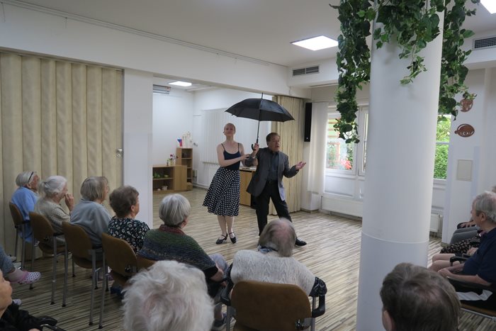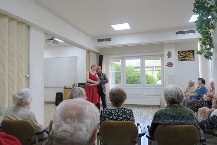 Čtvrteční dopoledne nás přišla potěšit zpěvem a tancem sympatická manželská rodina. Italský pěvec G. K. Rugierri a jeho žena baletka Soňa připravili pro naše klienty a zaměstnance opět bohatý repertoár nejen operních, ale také filmových písní. Zazněly španělská „Granada“, klasika z Francie z roku 1955 „Moře“ a „Turandot“, česká „Prodaná nevěsta“ italská „Rigoleto“ a také klasika „Nokturno č. 2.“ od F. Chopena. Zvučný hlas tenora se nesl nejenom společenskou místností, ale také chodbami domova. Umělcův zpěv doplňovala svými baletními kreacemi jeho žena a při filmové melodii „Zpívání v dešti“ si v rytmu klienti pohupovali nohami. Na závěr nechyběla známá a opěvovaná italská klasika O´Sole Mio.